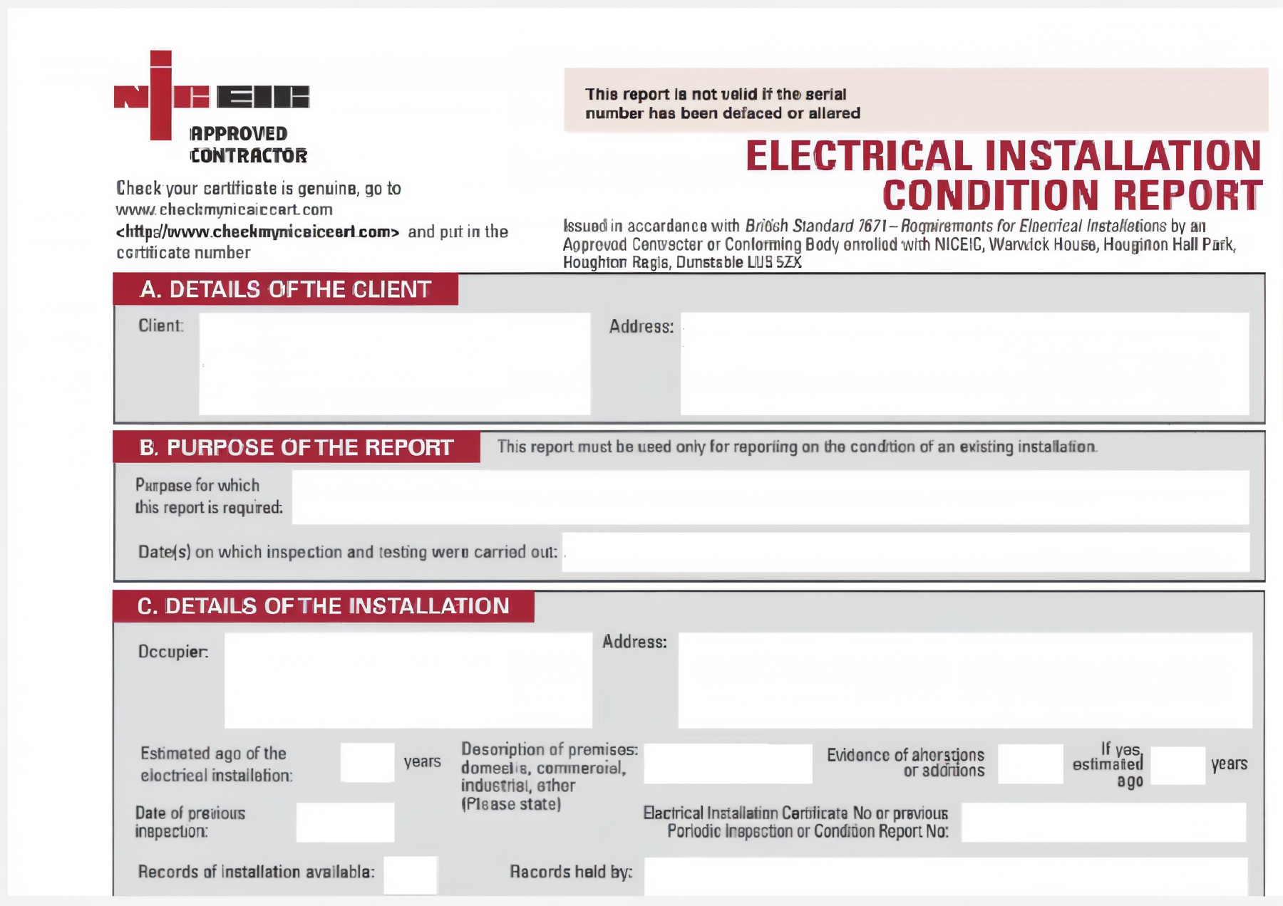 We provide an Electrical Installation Condition Report (EICR) from experienced engineers who audit and test a building's electrical system to ensure its safety. It finds damage, defects, and possible hazards in wiring, sockets, switches, and other electrical components and recommends repairs or enhancements to prevent electrical shocks, fires, and equipment failure.